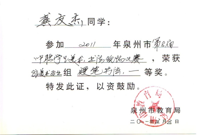 龚友杰同学荣获泉州市中职学生硬笔书法一等奖