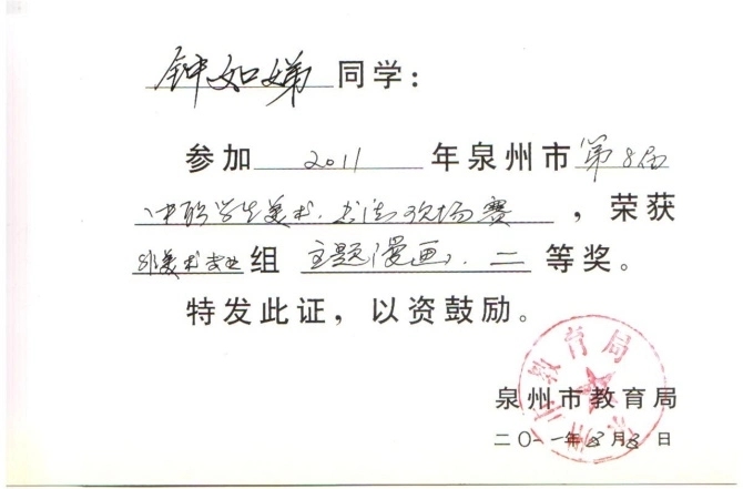 钟如娣同学荣获泉州市中职学生主题漫画二等奖