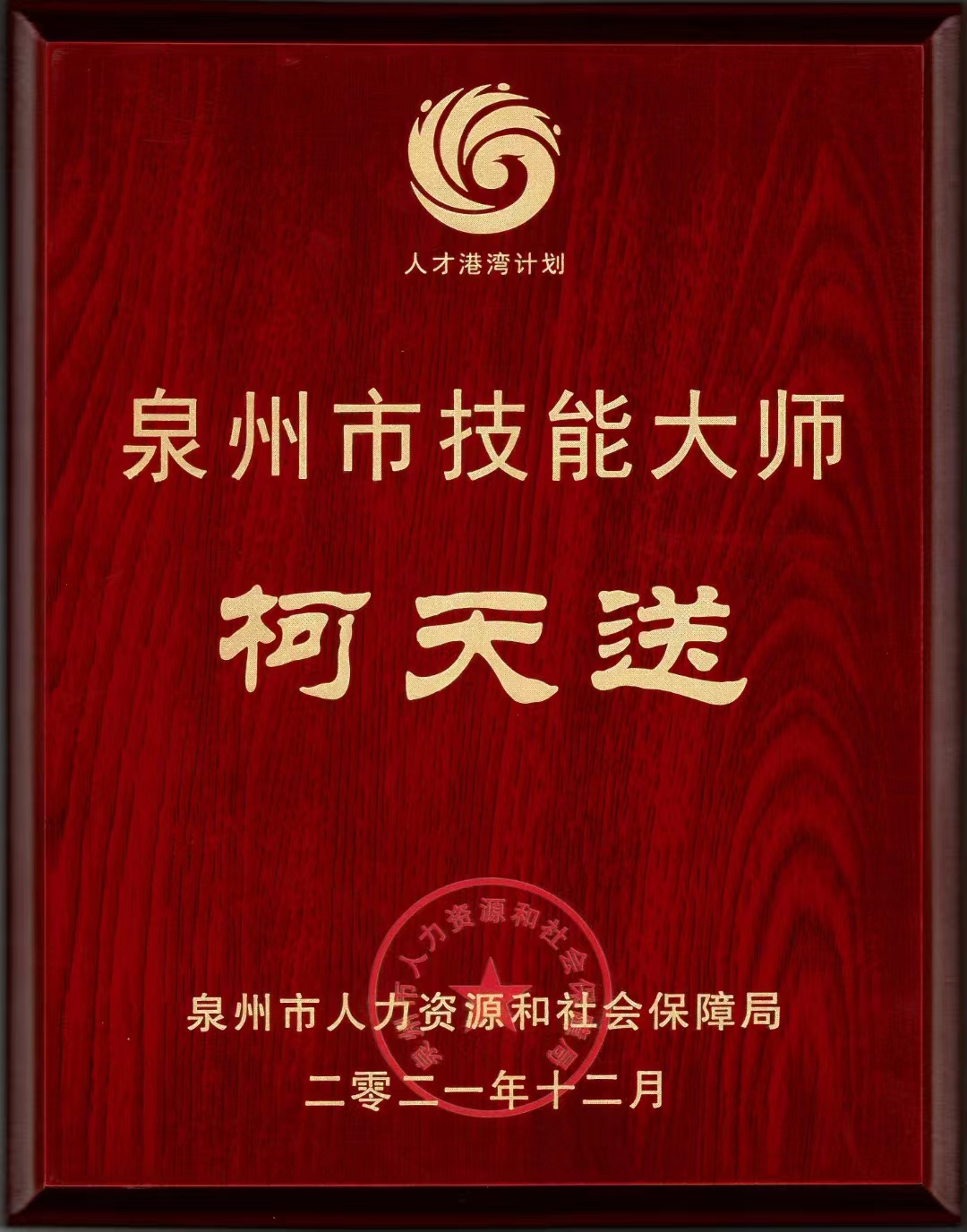 柯天送书记荣获泉州市技能大师称号