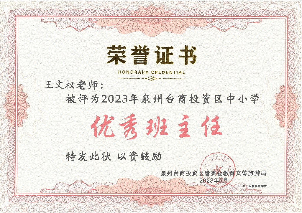 我校王文权老师被评为2022-2023学年度泉州台商投资区新时代“优秀班主任”