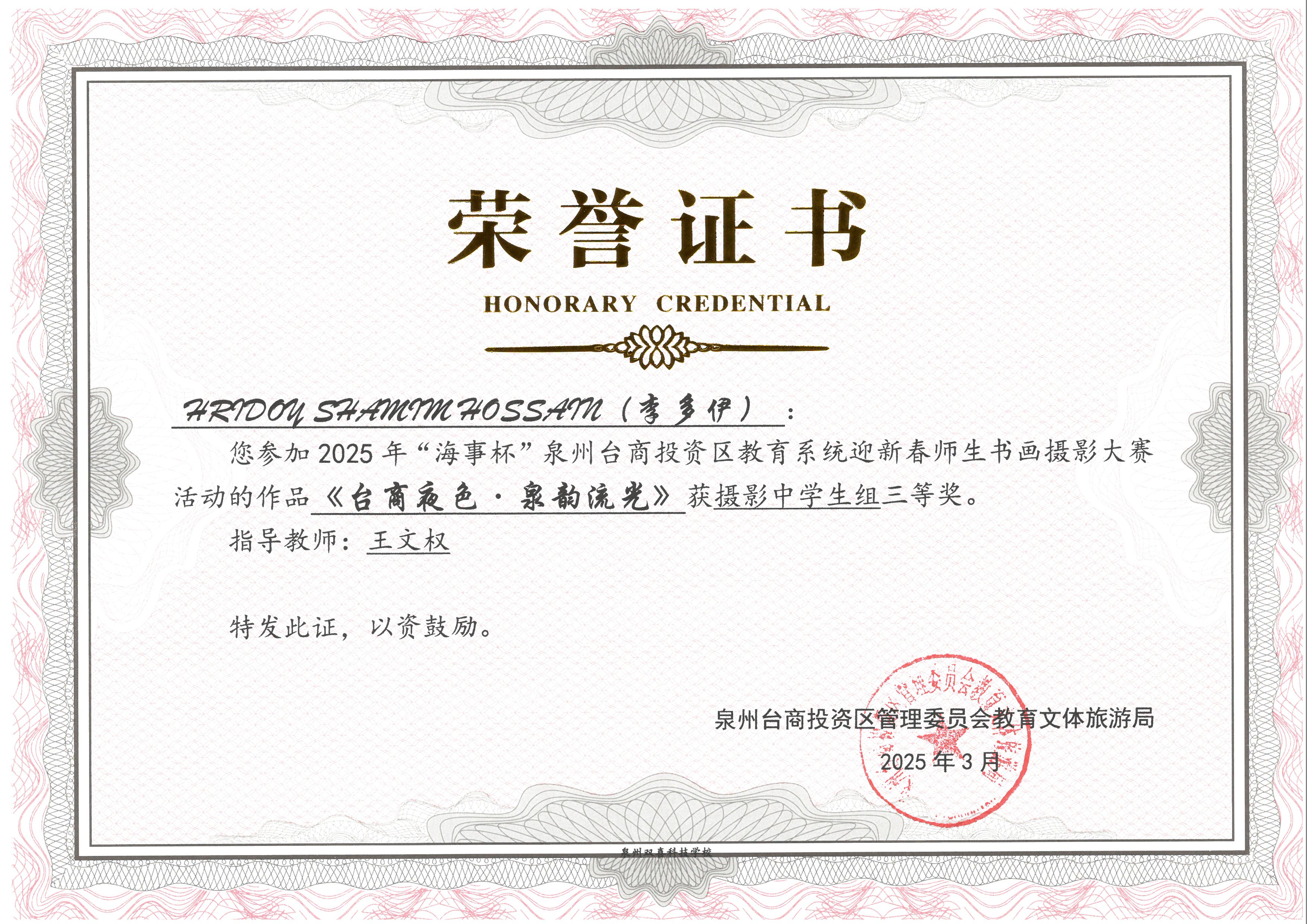 我校四名国际生荣获2025年台商区“海事杯”迎新春师生书画摄影大赛三等奖